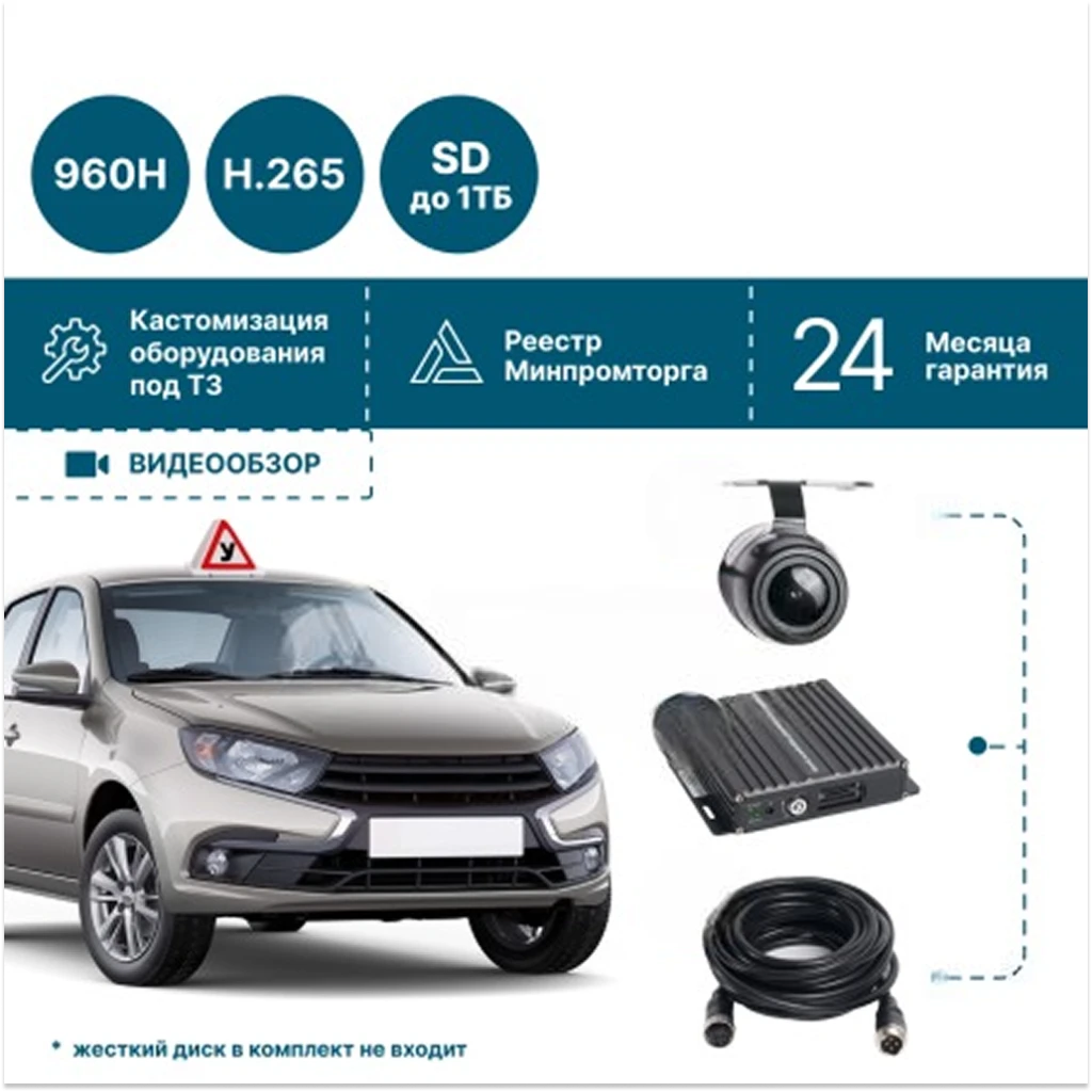 Готовый комплект видеонаблюдения для учебного автомобиля избавляет от необходимости подбирать оборудование отдельно. Все комплектующие совместимы и готовы к работе сразу после установки.